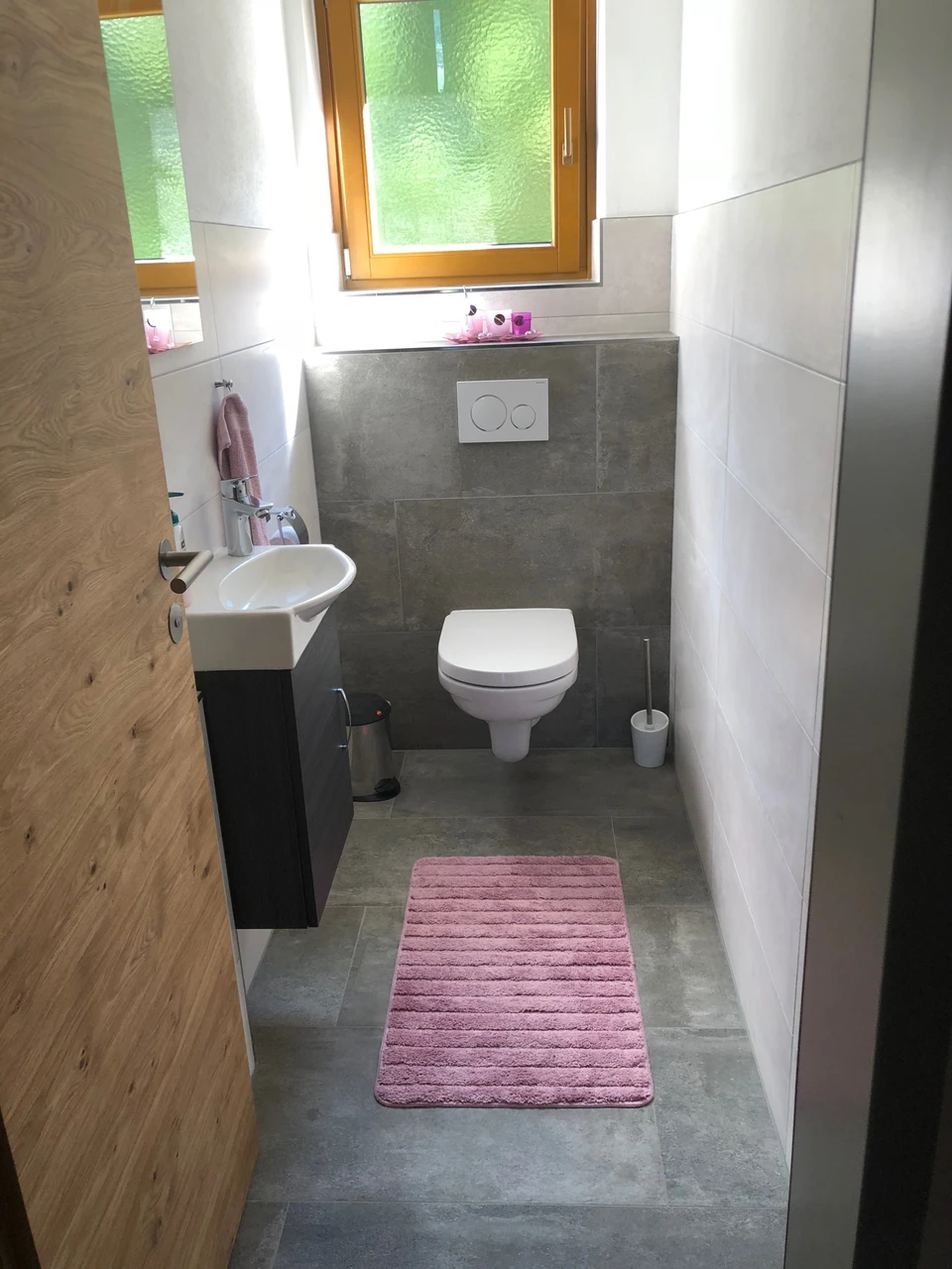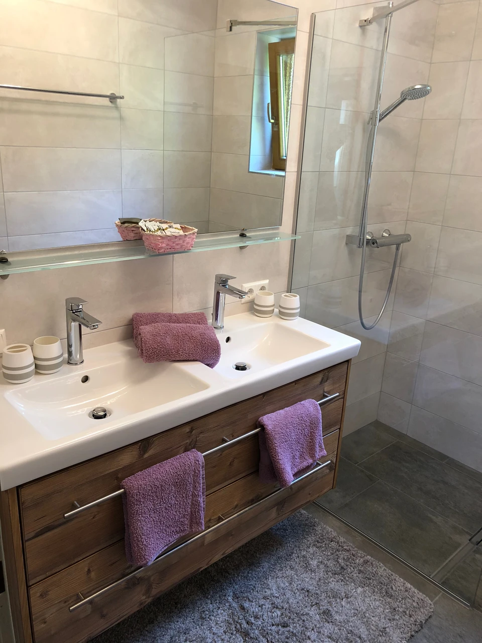 Moderne Badtechnik und funktionales Design zeichnen die beiden voneinander getrennten Räume Dusche und WC aus. Die bodenebene Dusche sorgt neben der optischen Grosszügigkeit für ein komfortables Duscherlebnis. Beide Räume verfügen jeweils über ein Fenster und dank luxuriösem Doppelwaschbecken gibt es kein Gedrängel vor dem Spiegel und der Morgen kann entspannt beginnen.
